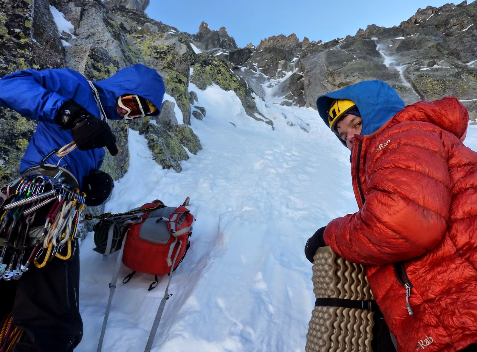 Bilo je videti stopinje iz prejšnjih dni, sneg v zajedah je bil na nekaterih mestih odstopljen. Ker nismo poznali dostopa smo se odločili da dostopimo podnevi in splezamo do polovice, kjer je tudi snežišče in balvani na desni , ki so nam nudili udobno zavetišče čez noč.